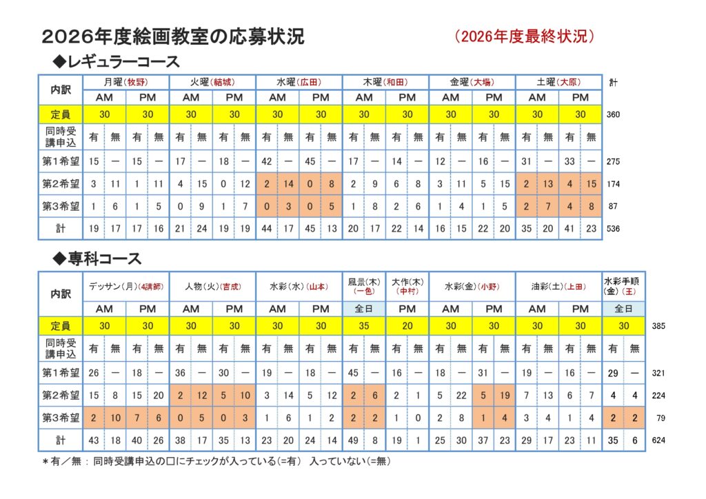2026年度絵画教室最終応募状況です。(2026年1月12日〆)