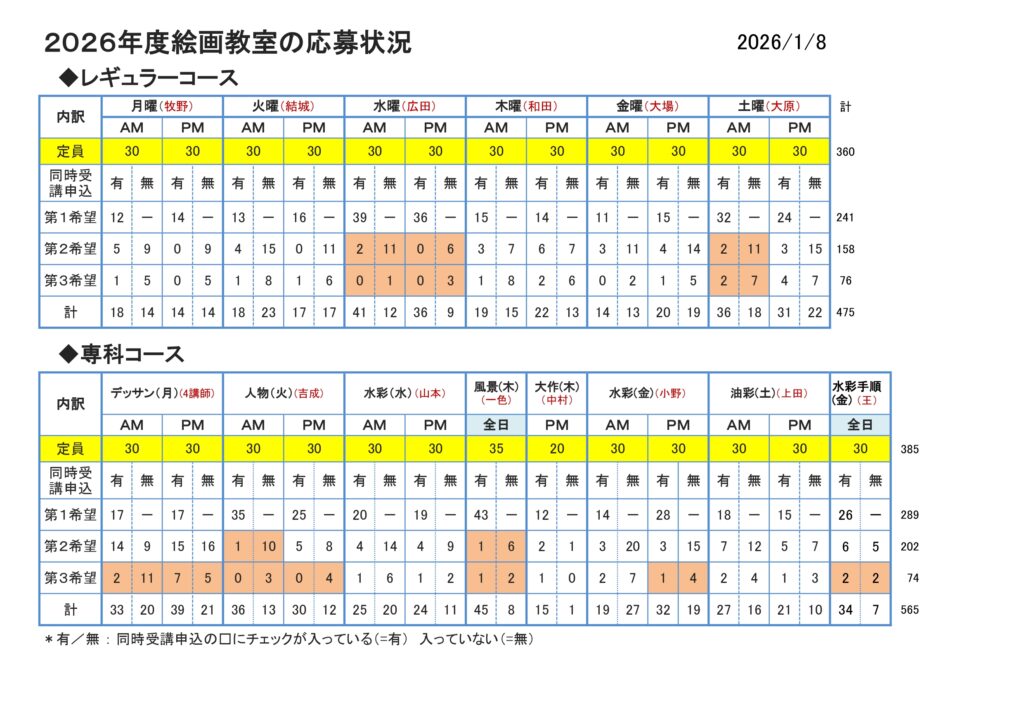 2026年度絵画教室応募状況です。(2026年1月8日)