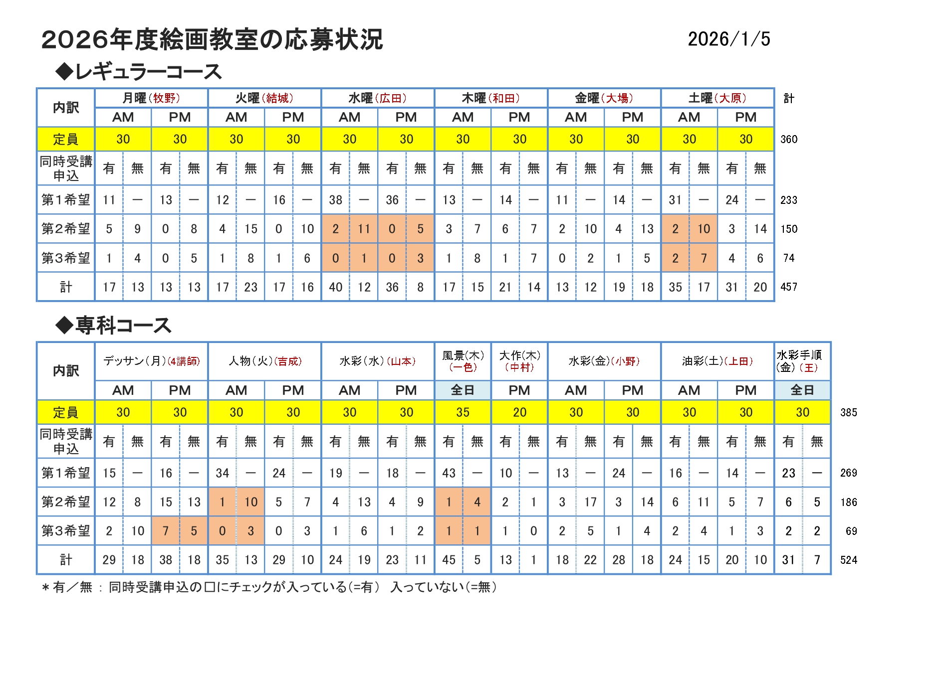 2026年度絵画教室応募状況です。(2026年1月5日)