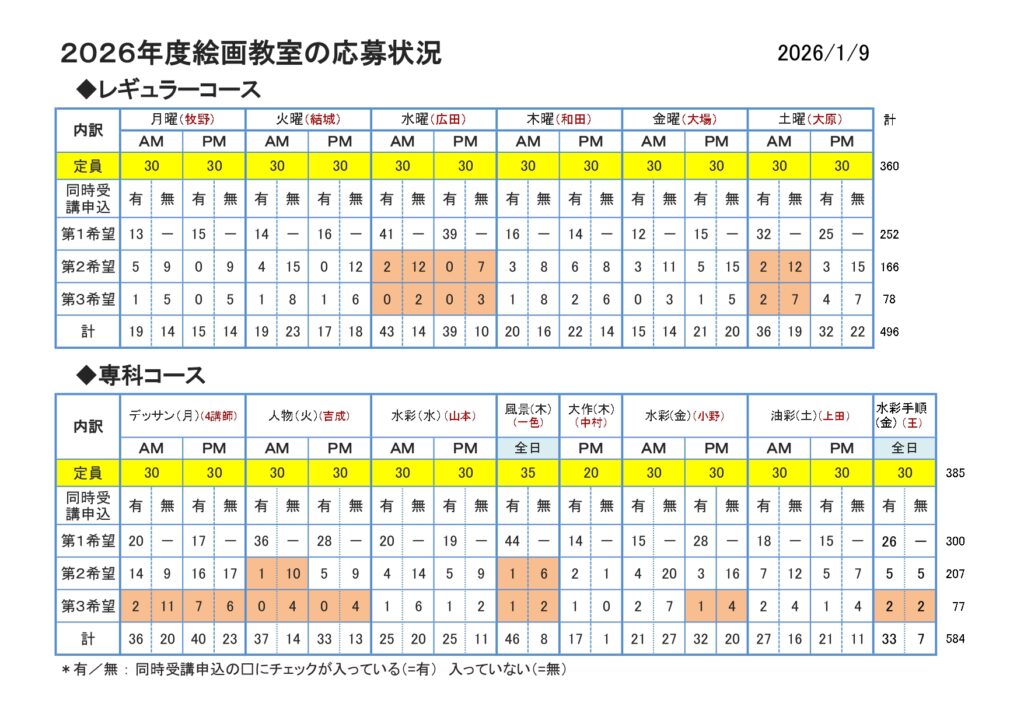 絵画教室最新応募状況(1/9現在)